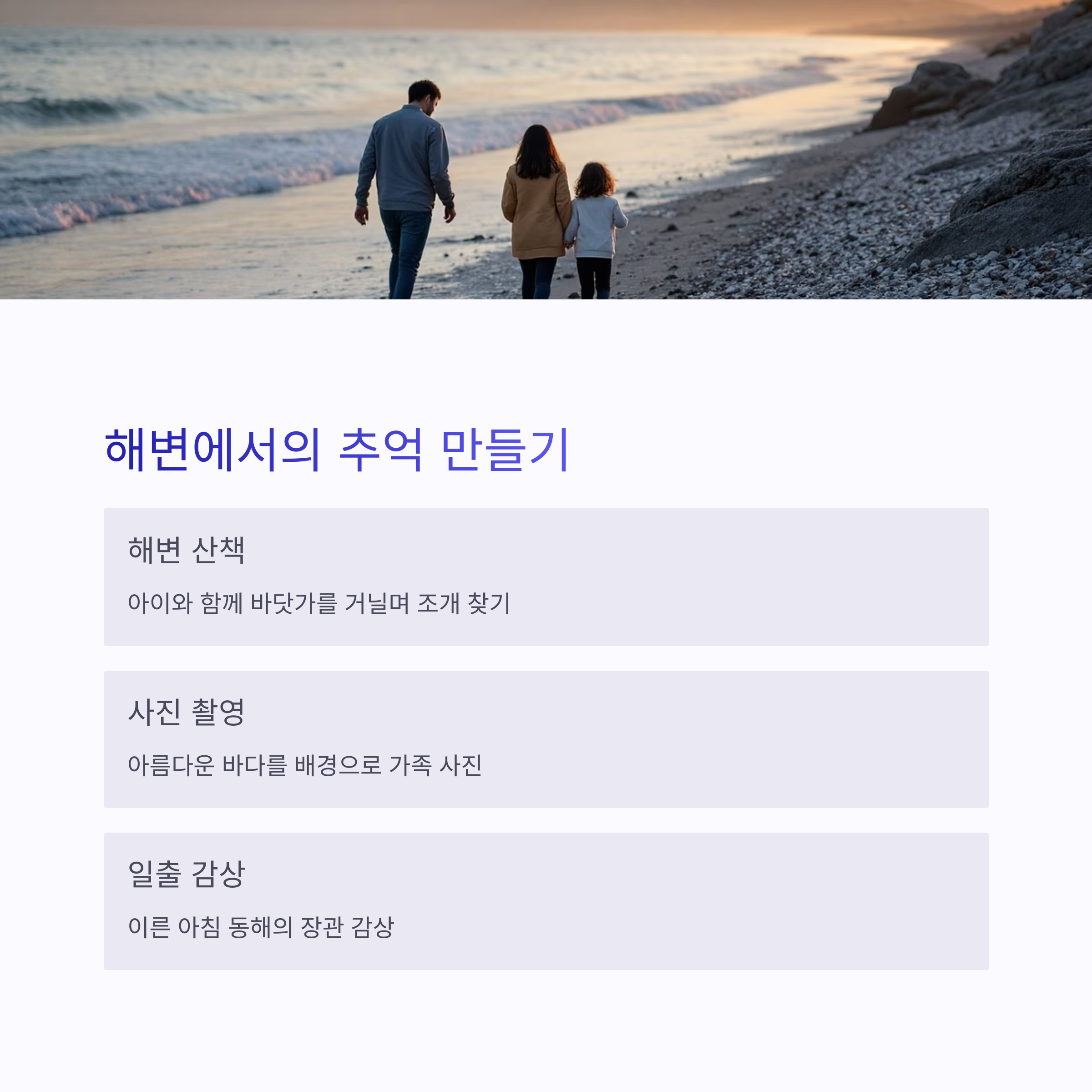 | 안전한 물놀이와 산책을 동시에 즐길 수 있는 곳 | 오션뷰 카페 거리에서 여유롭게 휴식 가능 | 아이와 함께하는 예술 체험과 힐링 산책 공간 |
