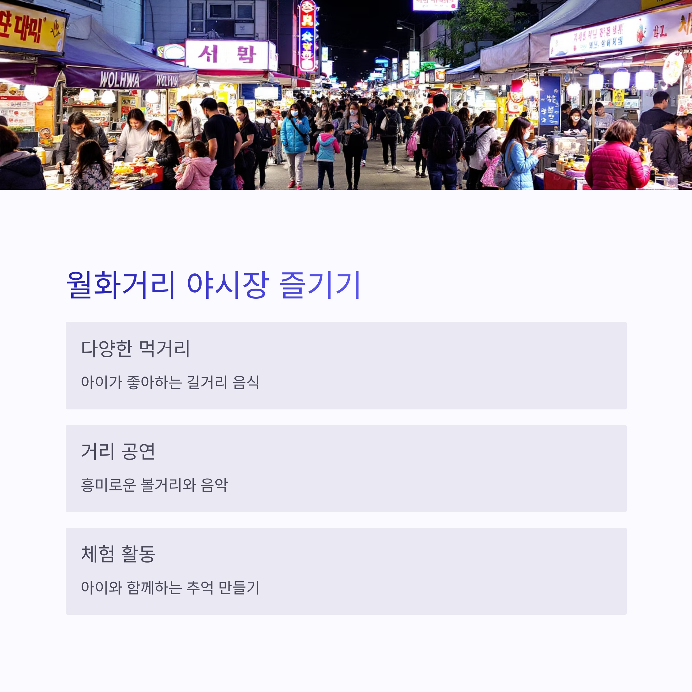 마지막 코스는 아이들에게 또 다른 재미를 선사할 수 있는 하슬라아트월드입니다. 이곳은 넓은 야외 조각공원과 실내 미술관, 바다 전망의 카페가 함께 구성된 복합 예술 공간입니다. 아이들과 함께 조형물을 감상하며 창의력을 키울 수 있고, 실내에서는 흥미로운 전시를 통해 새로운 시각을 경험할 수 있습니다. 저녁이 되면 월화거리 야시장으로 이동해 다양한 먹거리, 공연, 체험 부스를 돌아다니며 하루를 마무리하는 것도 좋은 선택입니다. 가족 모두에게 즐거움과 만족을 주는 하루 코스로 손색이 없습니다.