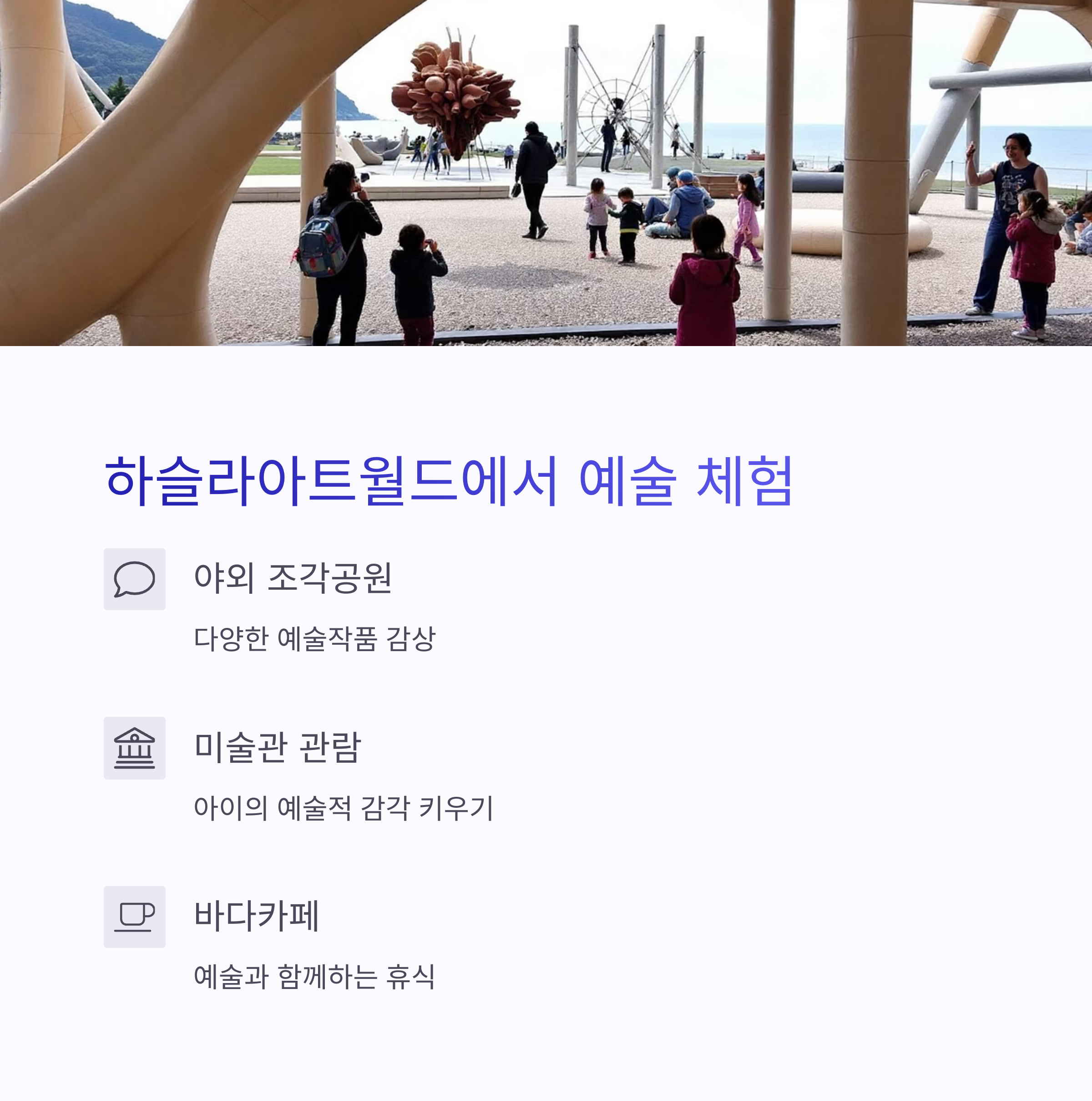 | 하슬라아트월드 | 아이와 함께하는 조각공원 속 미술 체험 공간 |