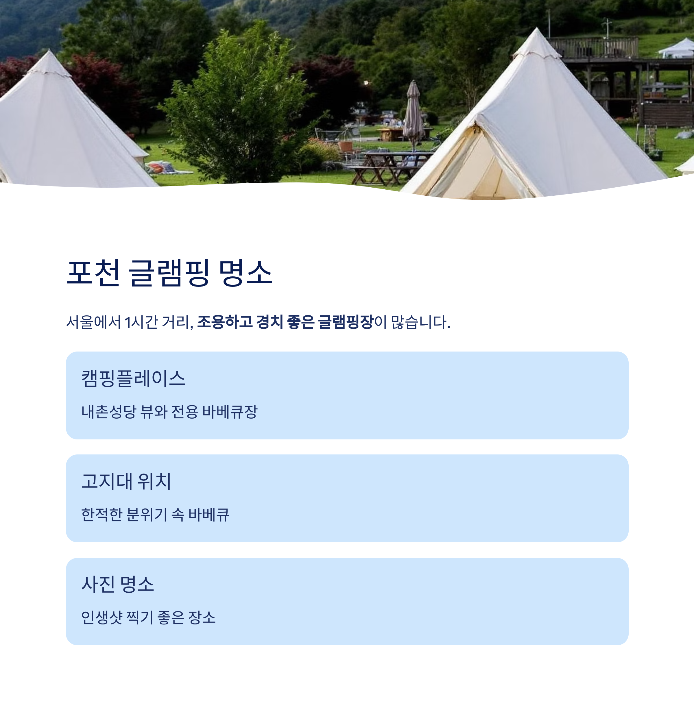 포천은 서울 근교 캠핑지 중에서도 조용하고 경치 좋은 글램핑장이 많기로 유명합니다.