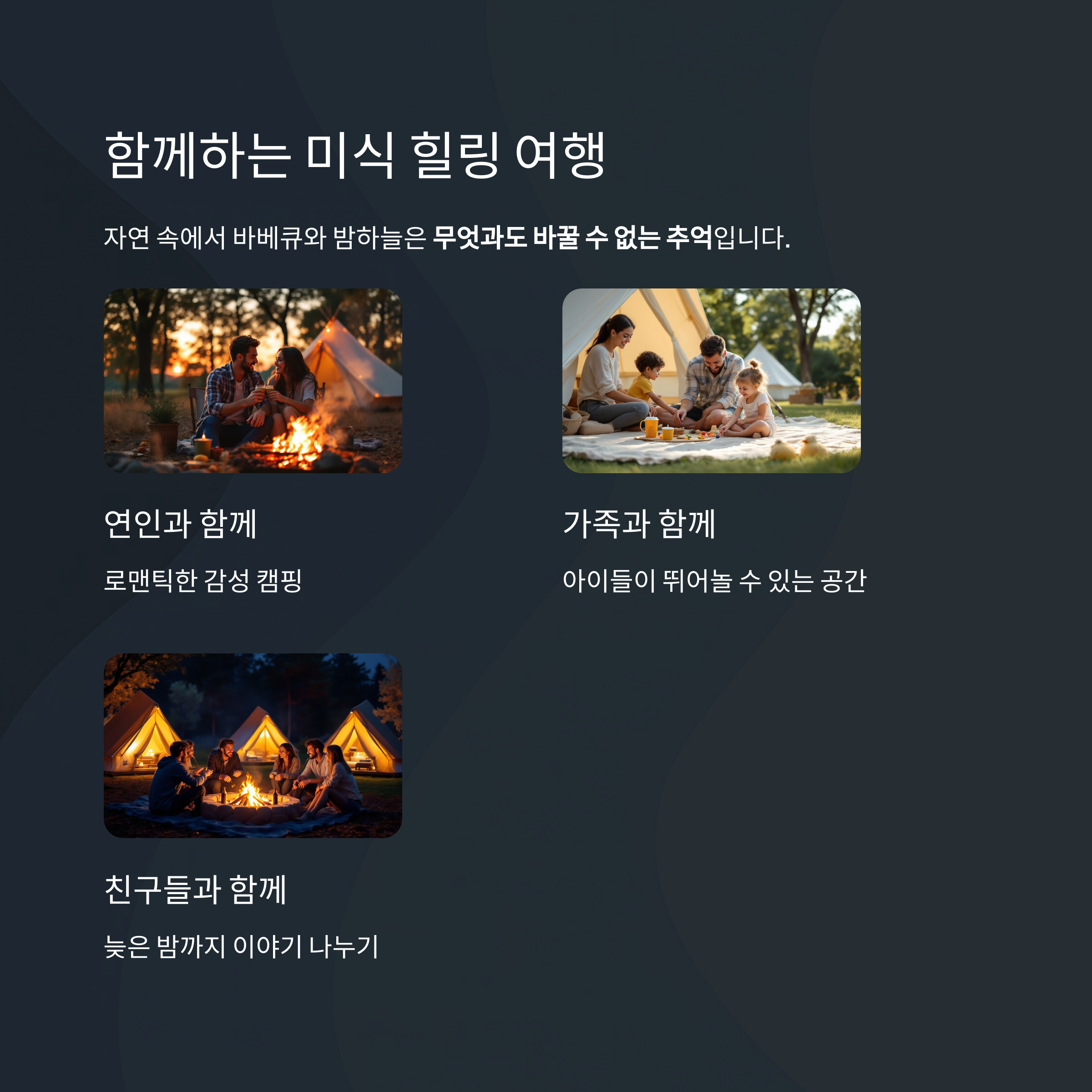 도시를 떠나 자연 속에서 고기를 굽고, 밤하늘을 보며 이야기 나누는 경험은 무엇과도 바꿀 수 없는 추억입니다.