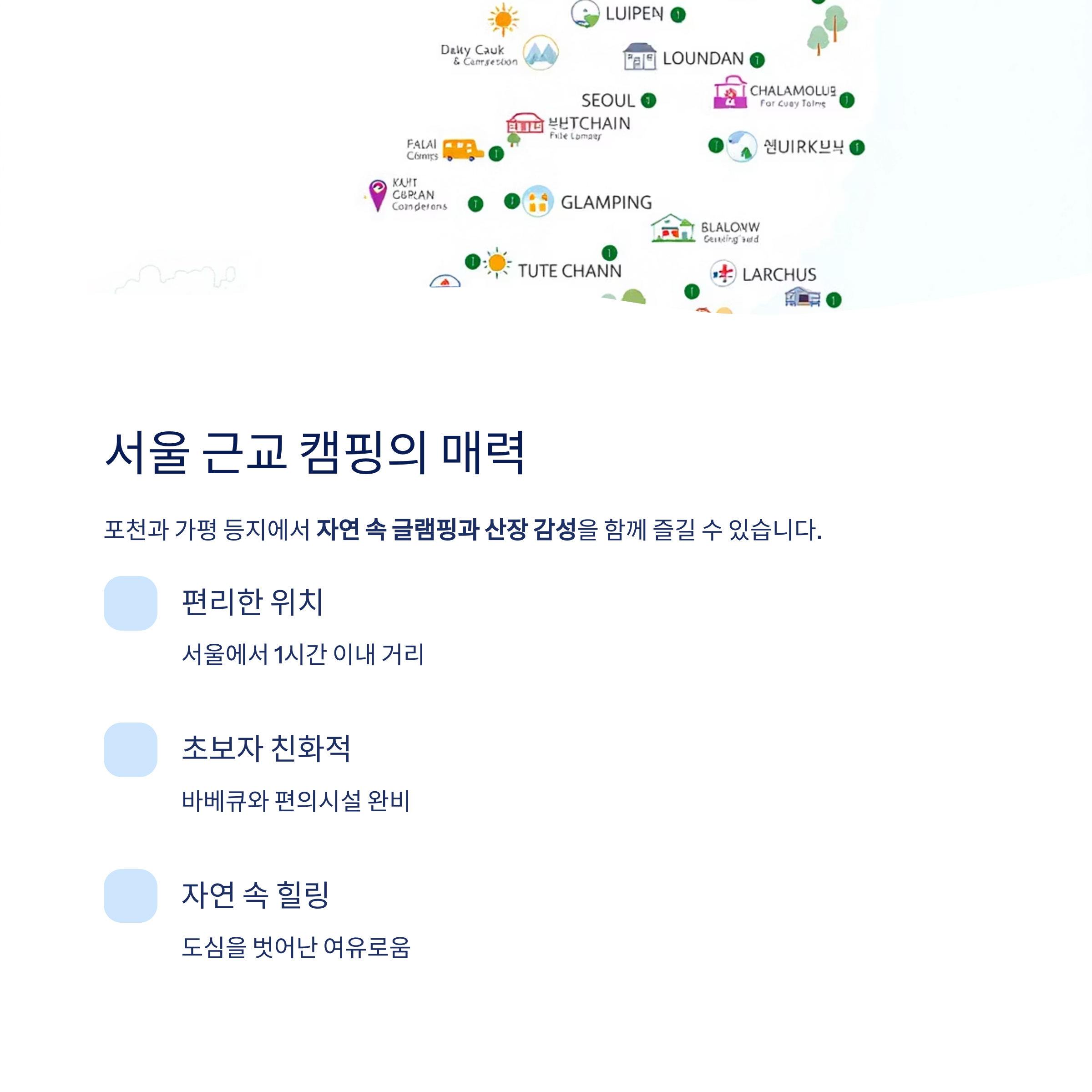이번 글에서는 서울 근교에서 글램핑과 바비큐, 산장 감성까지 누릴 수 있는 주요 캠핑장들을 소개드립니다.