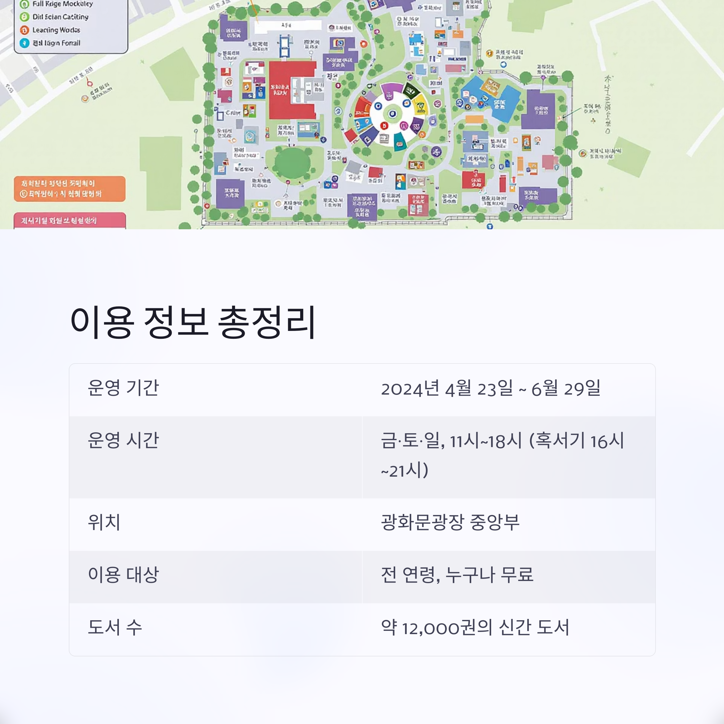 2024년 광화문 책마당은 4월 23일부터 6월 29일까지 약 두 달간 운영됩니다.