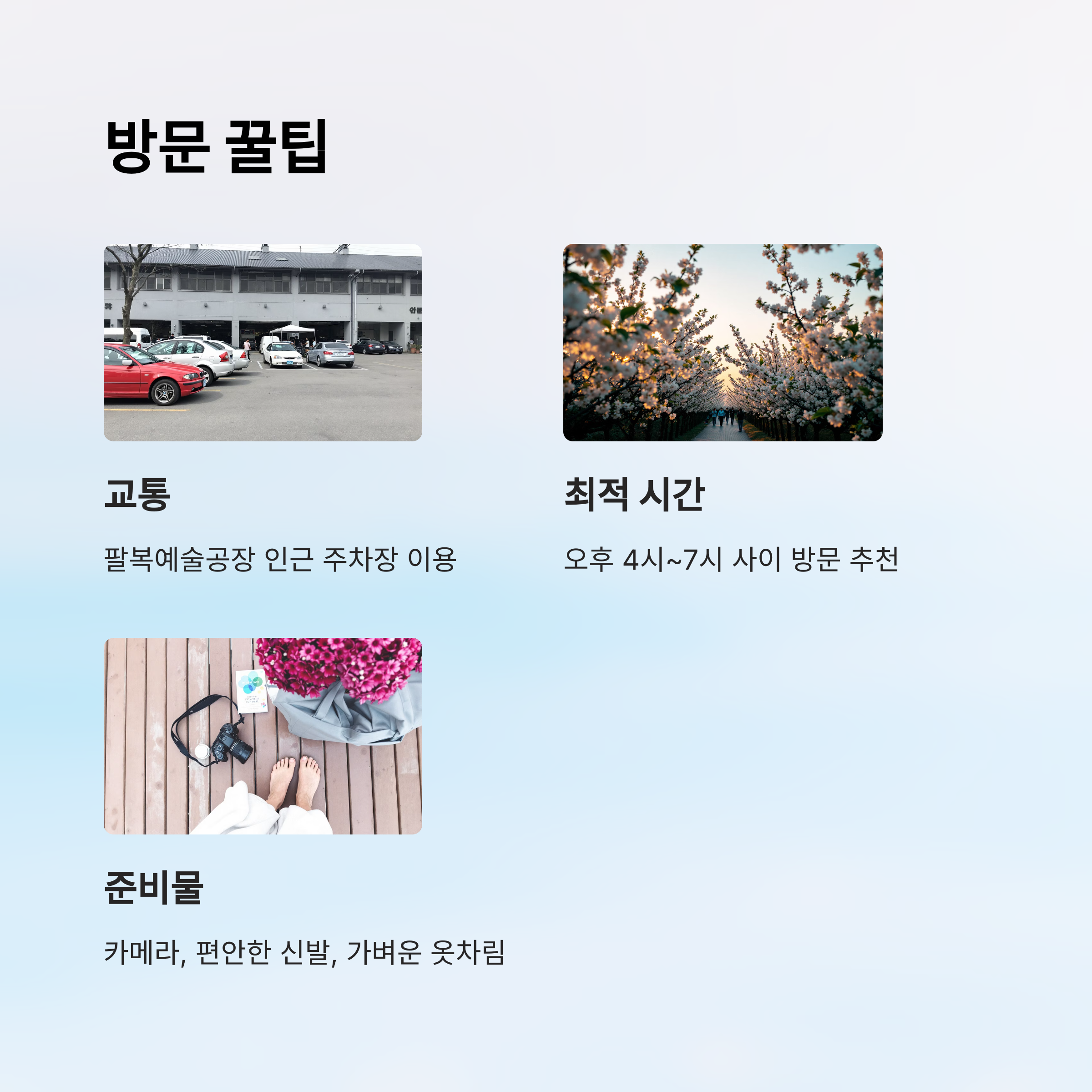 | 추천 여행 코스 | 팔복예술공장 - 철길 꽃길 - 한옥마을 연계 코스 |