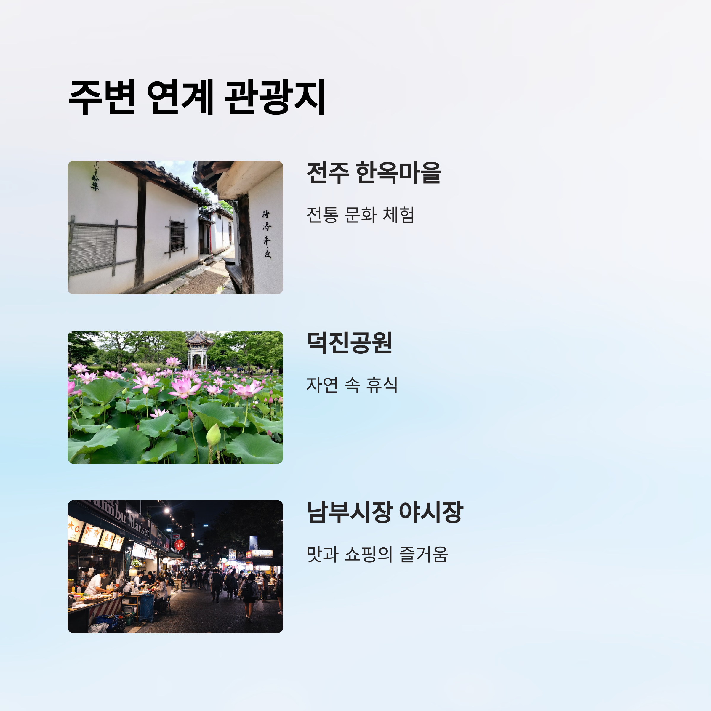 | 덕진공원, 한옥마을과 연계 여행 가능 | 낮과 밤 각각 다른 매력을 지닌 풍경 | 주차장 및 교통편 완비, 접근성 우수 |