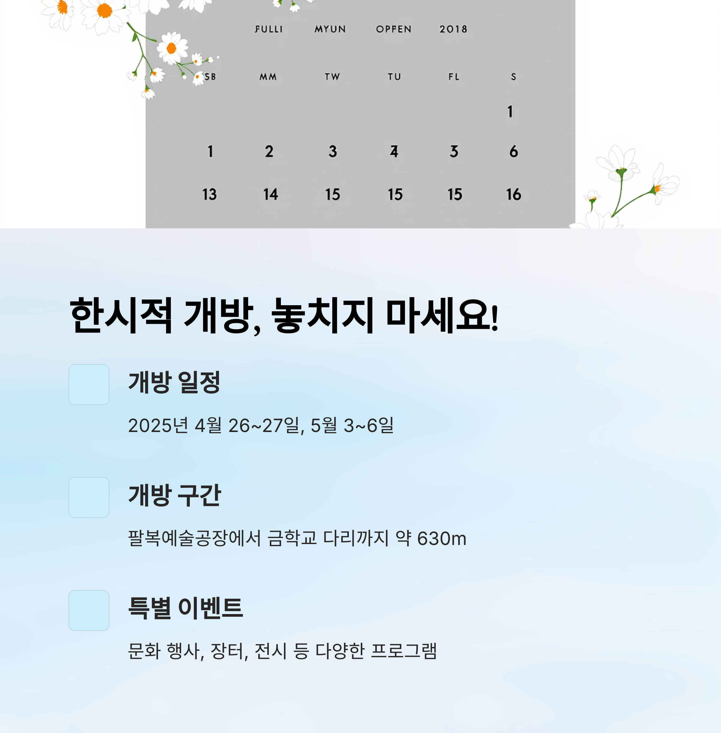 | 개방 일정 | 2025년 4월 26~27일, 5월 3~6일 한시 개방 |
