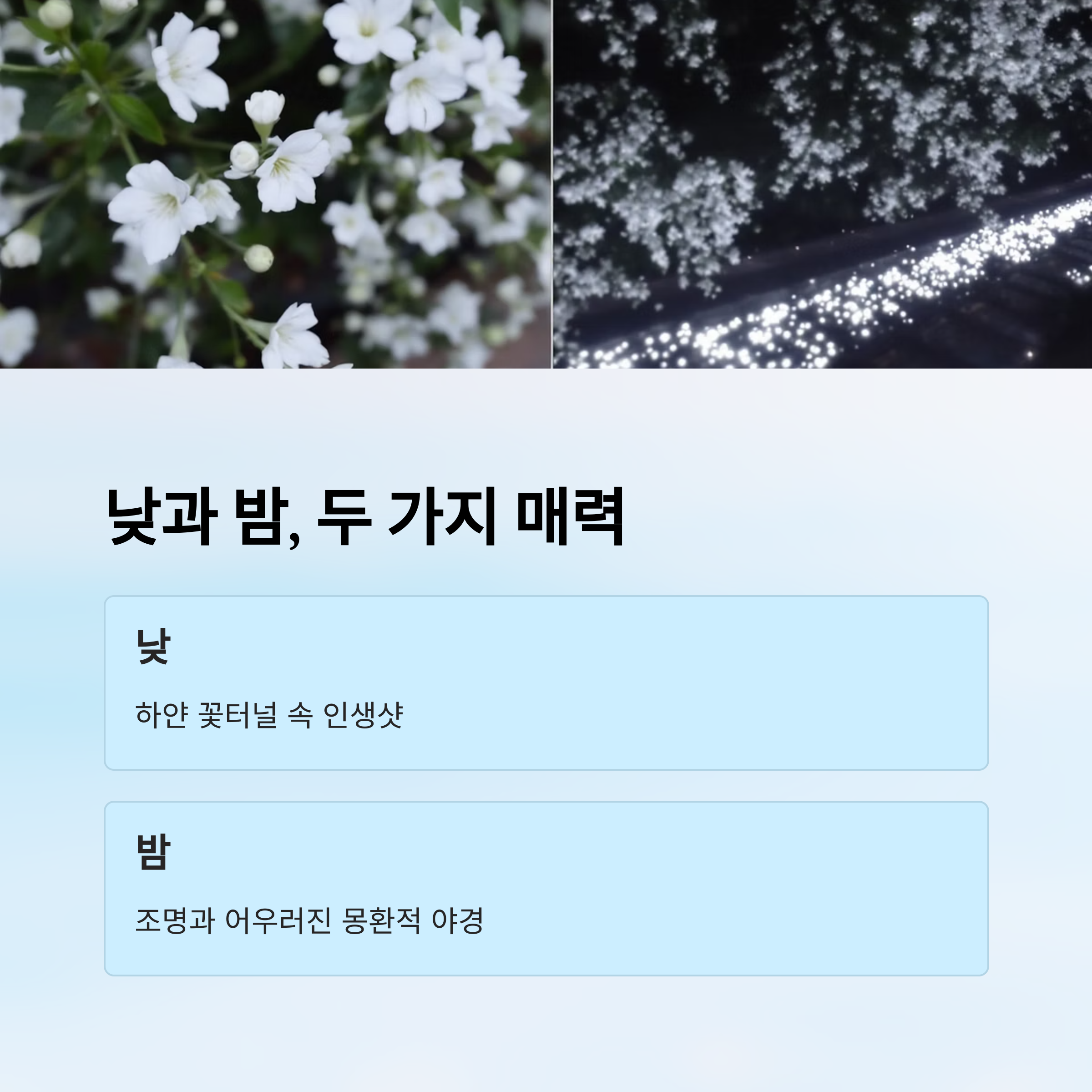 낮 시간에는 하얀 꽃터널을 배경으로 한 인생샷 촬영이 가능하고, 밤이 되면 다양한 조명과 어우러져 몽환적인 분위기를 자아냅니다. 이처럼 시간대에 따라 전혀 다른 매력을 지닌 이팝나무 철길은 하루 종일 머물며 즐기기 좋은 장소입니다. 인근에는 카페와 문화공간도 위치하고 있어, 여유롭게 쉬어가기에도 좋습니다.