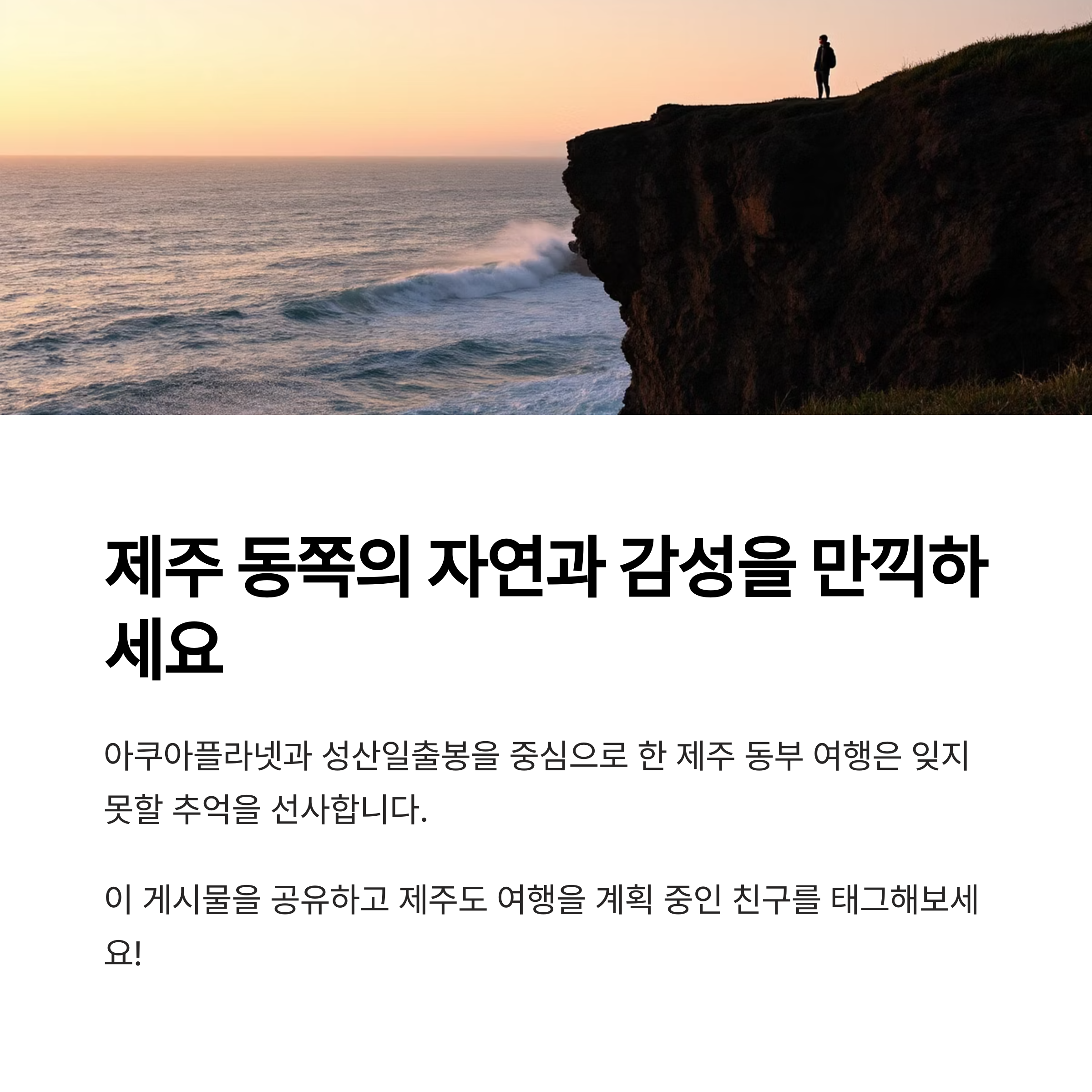 제주 동쪽 여행은 자연의 아름다움과 실내 체험의 조화가 뛰어난 코스입니다. 아쿠아플라넷 제주의 생생한 해양 체험과 성산일출봉의 장엄한 풍경은 누구에게나 인상적인 여행의 순간을 선사하죠. 특히 날씨의 영향을 받지 않는 실내외 조합은 여행 만족도를 높이는 큰 요소입니다. 아이들과 함께하는 가족 여행, 커플 여행, 효도 여행까지 모든 세대가 만족할 수 있는 코스로 추천드리며, 가까운 거리에 다양한 명소들이 밀집해 있어 일정 관리에도 매우 효율적입니다. 제주에서의 하루를 풍성하게 보내고 싶은 분들께 이 코스를 자신 있게 소개합니다.