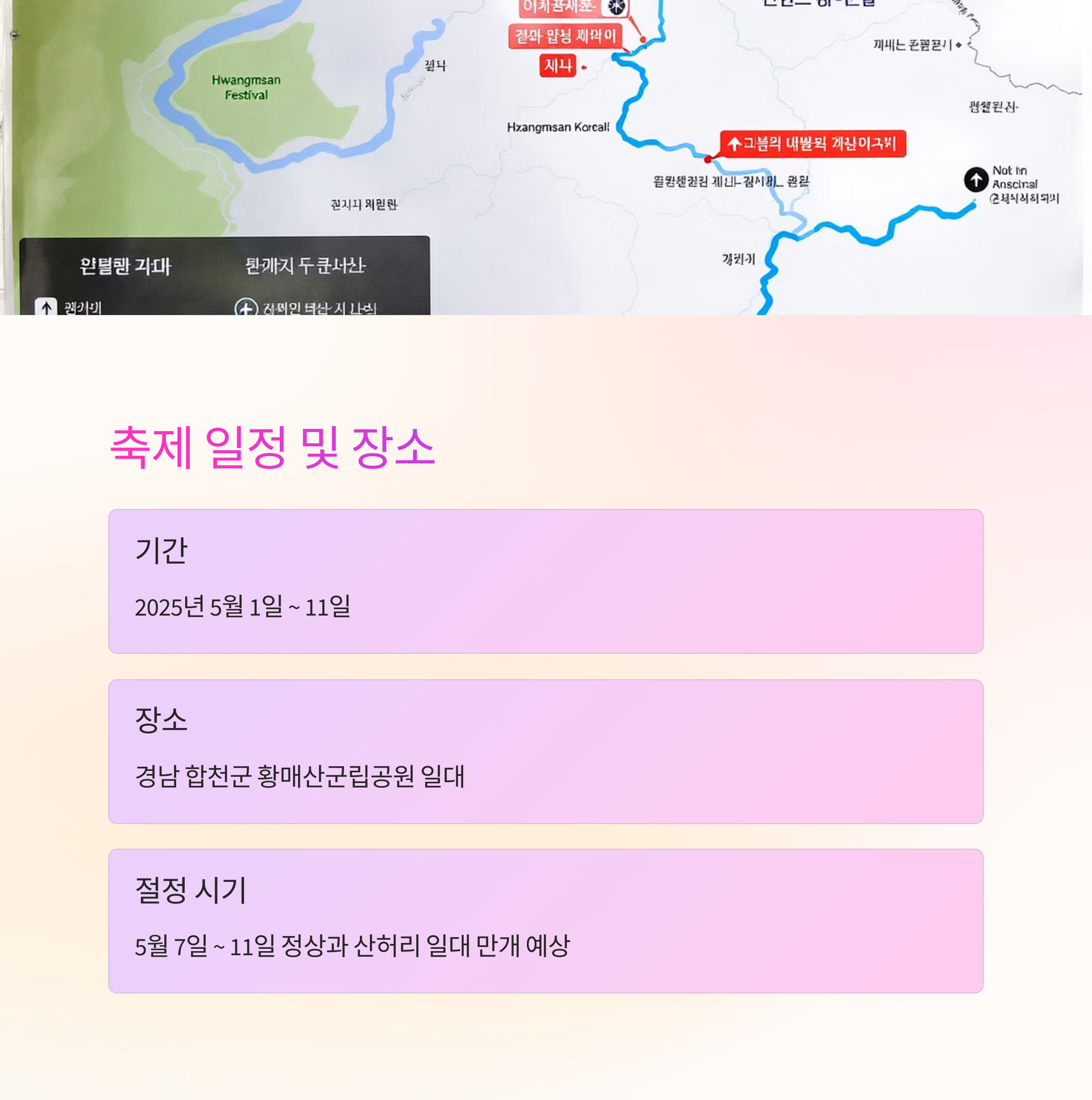 | 황매산 철쭉제 일정 | 2025년 5월 1일부터 11일까지 11일간 진행 |