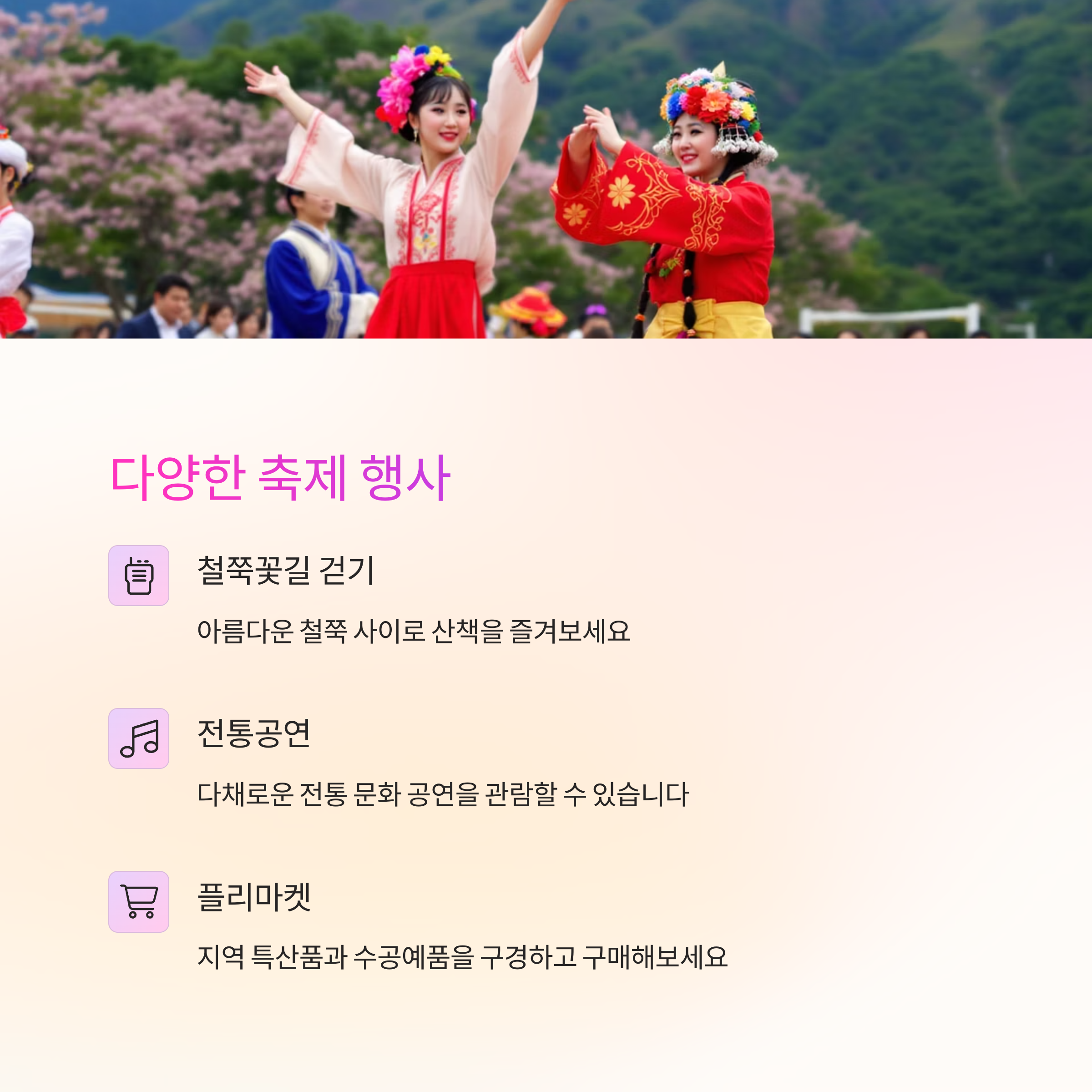 축제는 단순한 꽃 감상을 넘어 지역 주민들이 함께 준비한 전통공연, 플리마켓, 다양한 체험 프로그램까지 풍성하게 마련되어 있습니다. 어린이들을 위한 놀이 부스와 체험 활동이 많아 가족 단위 방문객에게도 인기 있으며, 고즈넉한 산세와 맑은 공기는 부모님과 함께하는 효도 여행지로도 안성맞춤입니다. 특별한 장비 없이도 편하게 즐길 수 있는 코스들이 많아 봄을 만끽하며 건강한 시간을 보낼 수 있습니다.