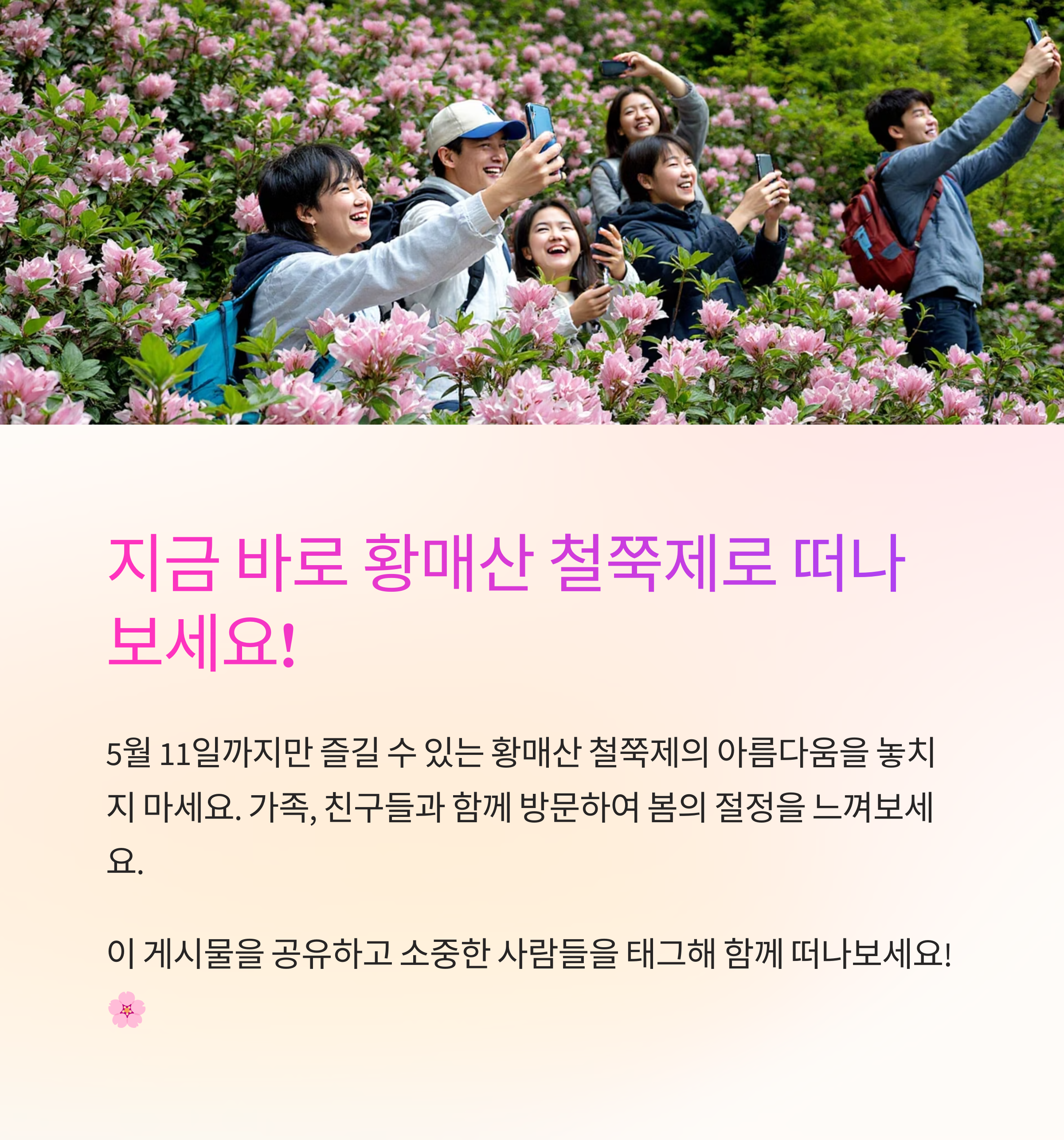 자연이 선사하는 봄의 절정을 몸소 체험하고 싶은 분들에게 황매산 철쭉제는 더없이 좋은 기회가 될 것입니다. 특별한 계획이 없는 5월 초, 자연과 꽃의 아름다움을 동시에 만끽할 수 있는 이 축제에서 여유와 감동을 느껴보세요. 가족, 연인, 친구와 함께 하는 이 시간은 평생 기억에 남을 소중한 추억이 될 것입니다. 교통과 편의시설도 잘 갖춰져 있어 누구나 편하게 다녀올 수 있으니, 이번 주말 여행지는 바로 황매산으로 정해 보는 건 어떨까요?