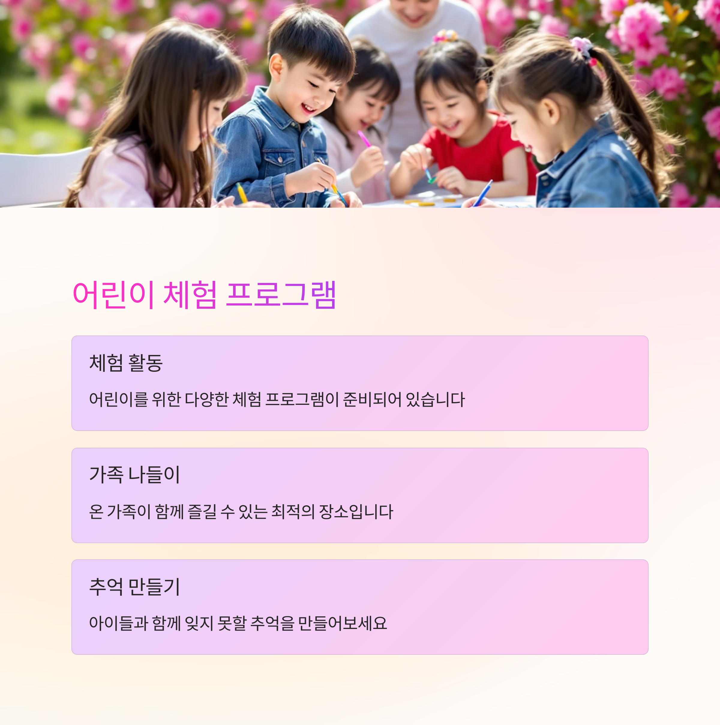 가족과 함께 즐기는 나들이 장소로 손색이 없으며, 축제 기간 동안에는 철쭉꽃길 걷기 체험부터 전통공연, 플리마켓, 어린이 체험 프로그램까지 다양하게 준비되어 있어 남녀노소 모두가 만족할 수 있는 시간을 보낼 수 있습니다.