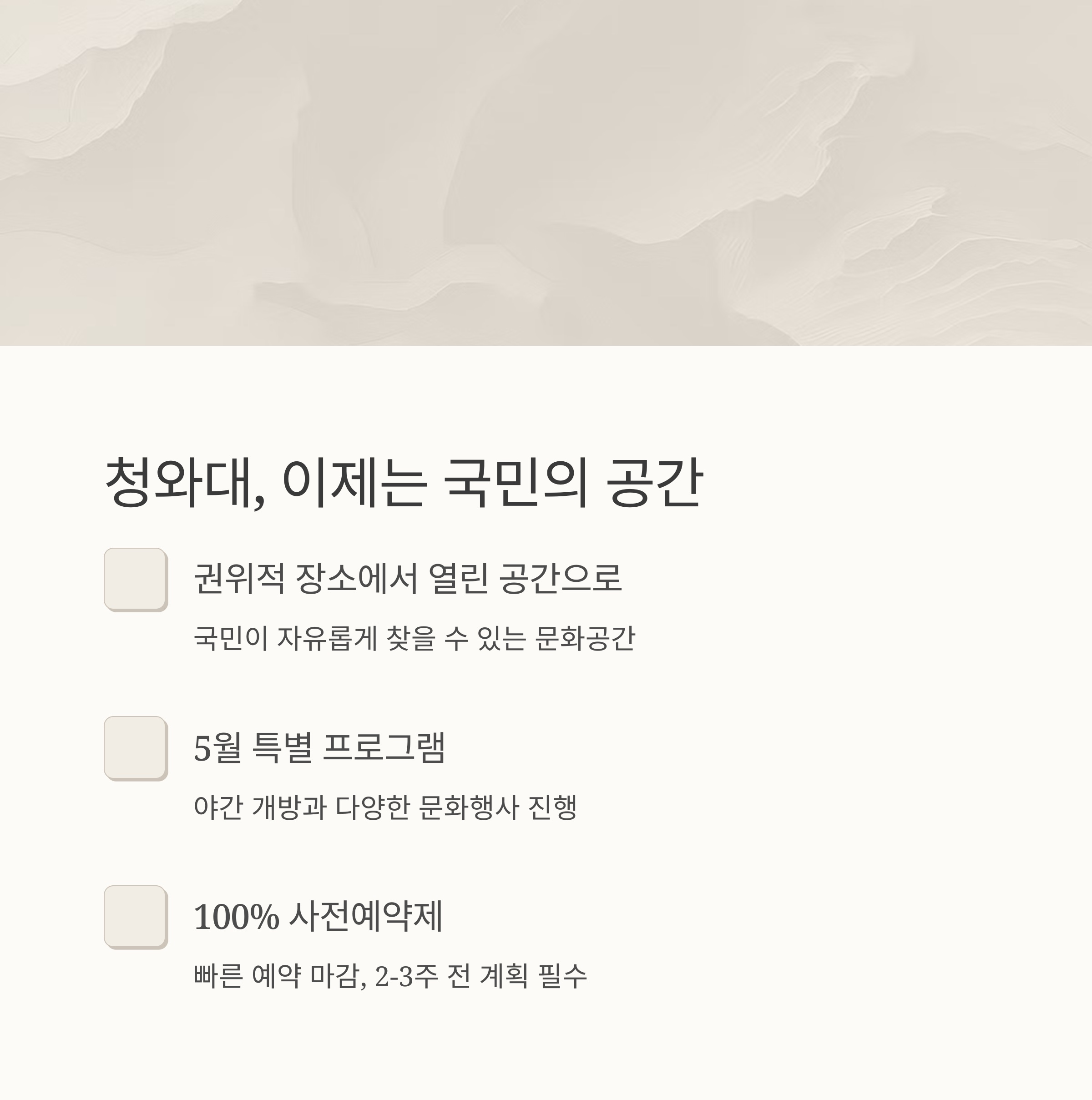 와대는 과거 권위의 상징에서 이제는 국민이 직접 체험하고 문화를 공유할 수 있는 열린 공간으로 거듭났습니다. 이번 5월, 야간 개방이라는 특별한 기회를 통해 청와대의 새로운 모습을 경험해 보는 것은 아주 뜻깊은 일이 될 것입니다. 그러나 많은 사람들이 몰리는 만큼 예약과 이동 수단, 주차 문제 등을 사전에 꼼꼼하게 준비하셔야 보다 여유롭고 만족스러운 관람이 가능하다는 점 잊지 마세요. 이번 콘텐츠가 여러분의 준비에 실질적인 도움이 되었기를 바라며, 현명하고 알찬 청와대 관람이 되시기를 기원합니다!