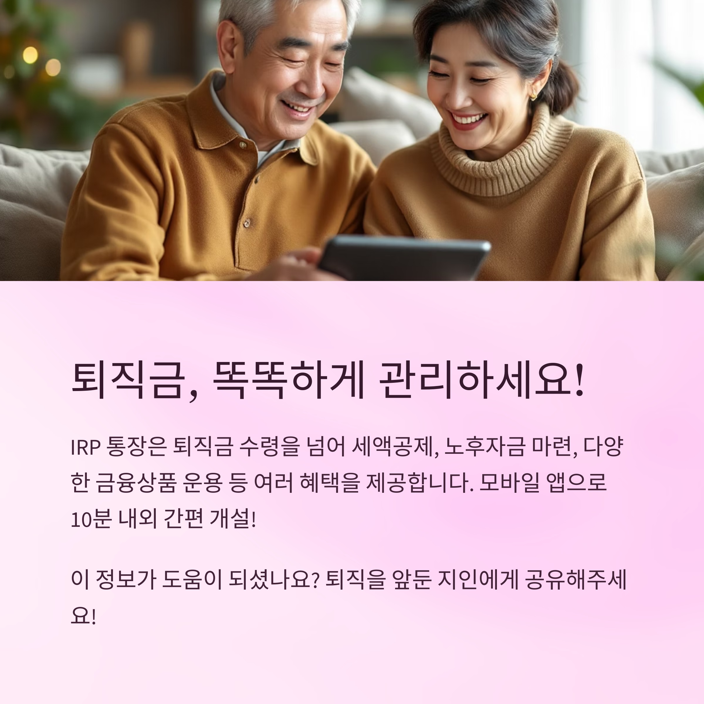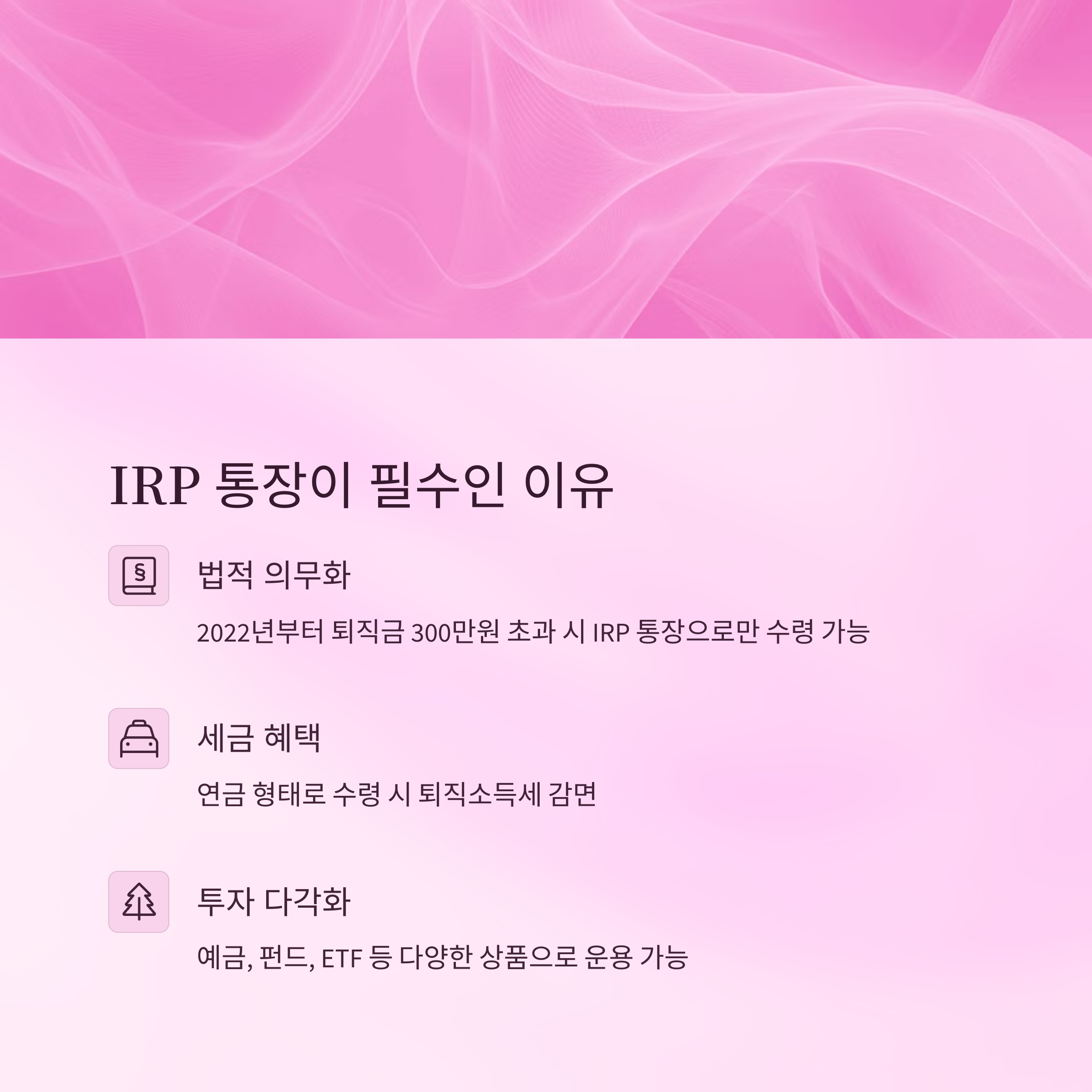 IRP 통장은 단순한 퇴직금 수령 통장을 넘어, 세제 혜택과 자산 운용의 장점을 모두 누릴 수 있는 종합 자산관리 계좌입니다. 퇴직금을 어떻게 활용할지, 노후 자금을 어떻게 준비할지 고민이라면 IRP 통장을 통한 체계적인 관리가 필수입니다.