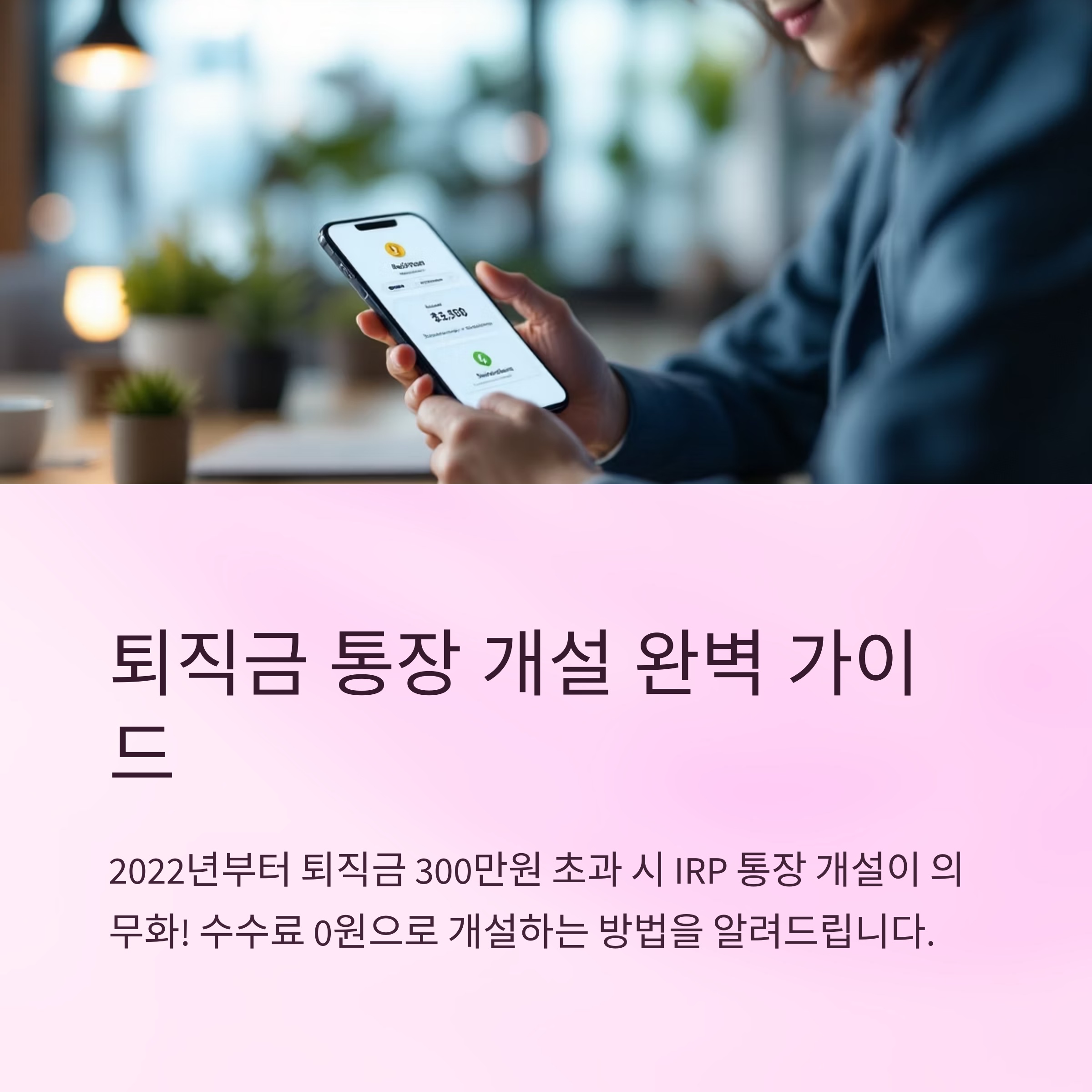 퇴직금 통장 개설방법과 수수료 면제혜택에 대해 궁금하신가요? 2022년부터 퇴직금이 300만 원을 초과하면 IRP(개인형 퇴직연금) 통장 개설이 의무화되면서 많은 직장인들이 혼란을 겪고 있습니다. 은행이나 증권사 방문 없이 비대면으로 개설할 수 있는지, 수수료는 얼마나 발생하는지, 어떤 금융사가 가장 유리한지 고민되시죠? 이 글에서는 퇴직금 IRP 통장의 모든 것을 알려드립니다. 수수료 0원 개설 방법부터 세제 혜택까지, 똑똑한 퇴직금 관리를 위한 완벽 가이드를 시작합니다.