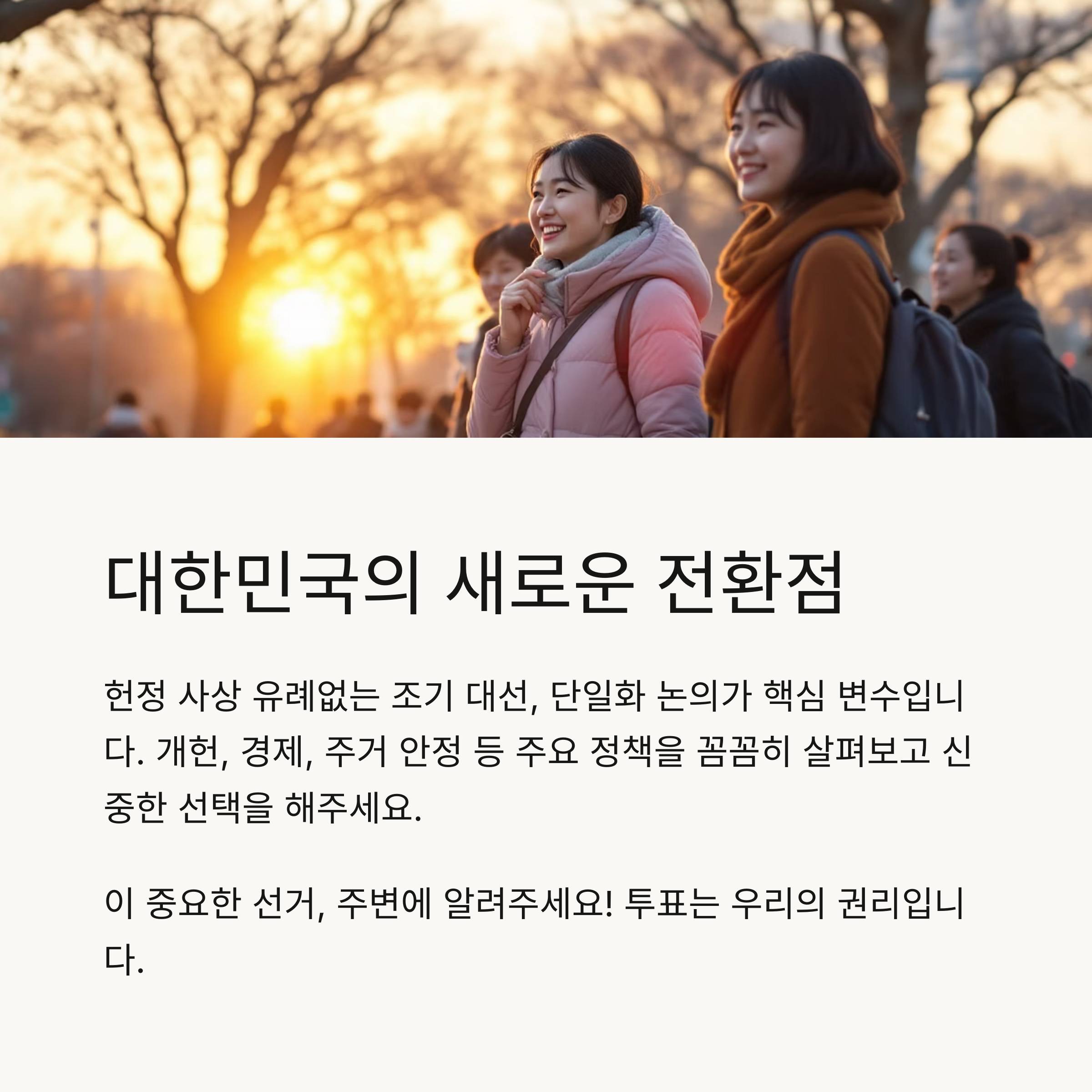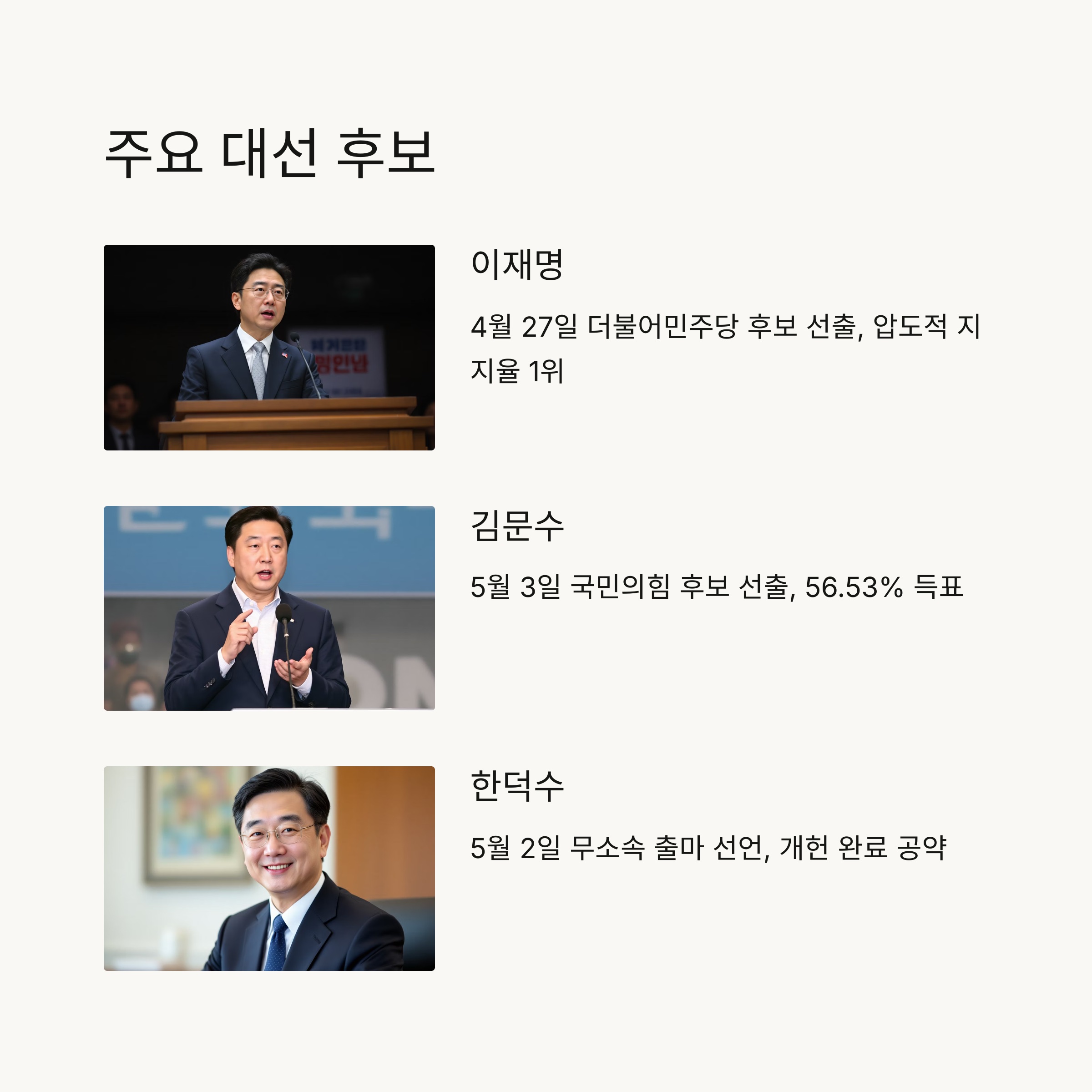 2025년 6월 3일 치러질 21대 대통령선거는 헌정 사상 유례없는 조기 대선으로, 윤석열 전 대통령의 탄핵 인용이라는 특수한 배경 속에서 진행됩니다. 이재명 후보의 높은 지지율 속에서 김문수 후보와 한덕수 후보 간의 단일화 논의가 핵심 변수로 떠오르고 있으며, 개헌, 경제 활성화, 주거 안정 등이 주요 정책 이슈로 부각되고 있습니다.