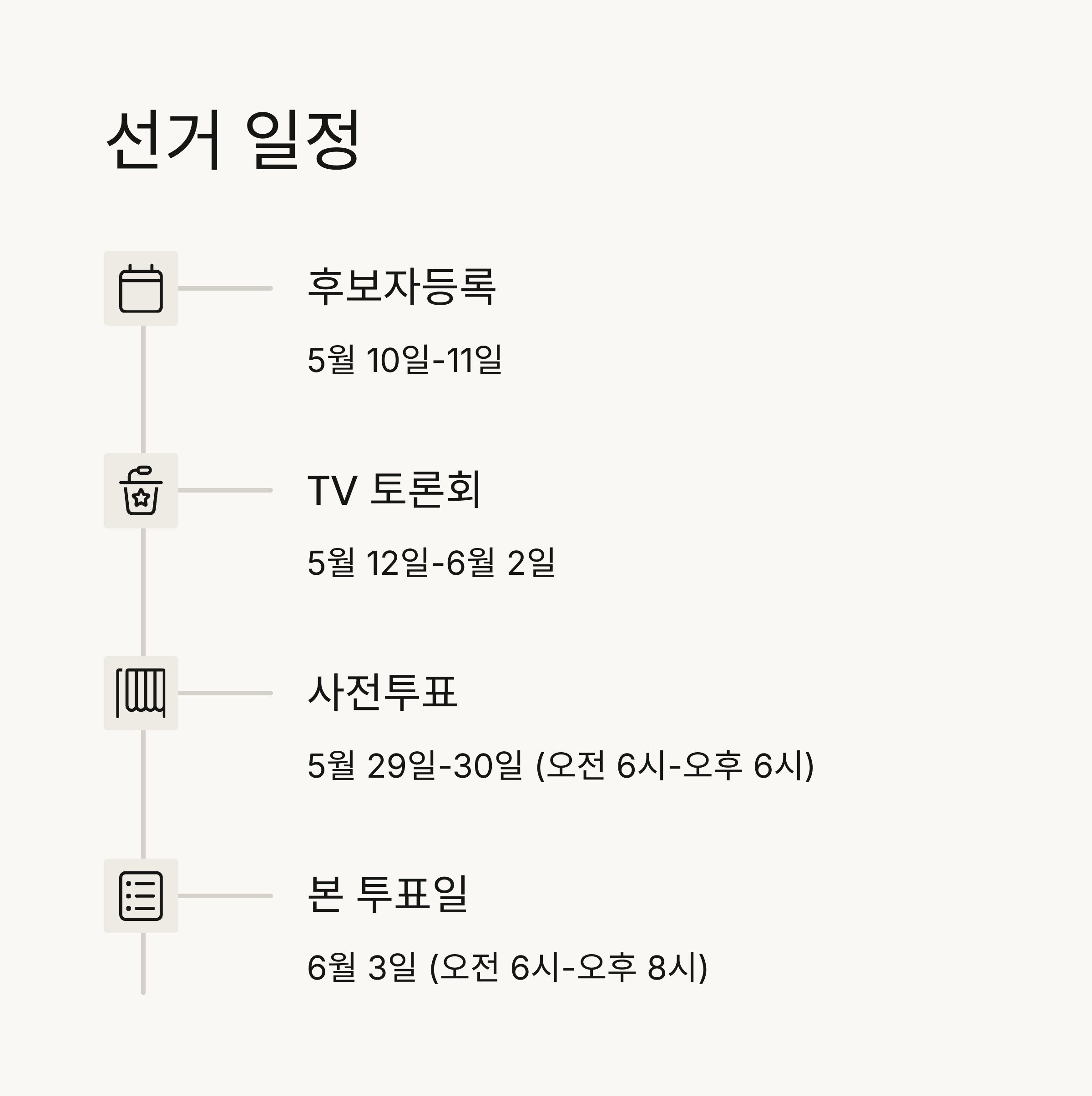- 6월 3일: 본 투표일 (오전 6시~오후 8시)