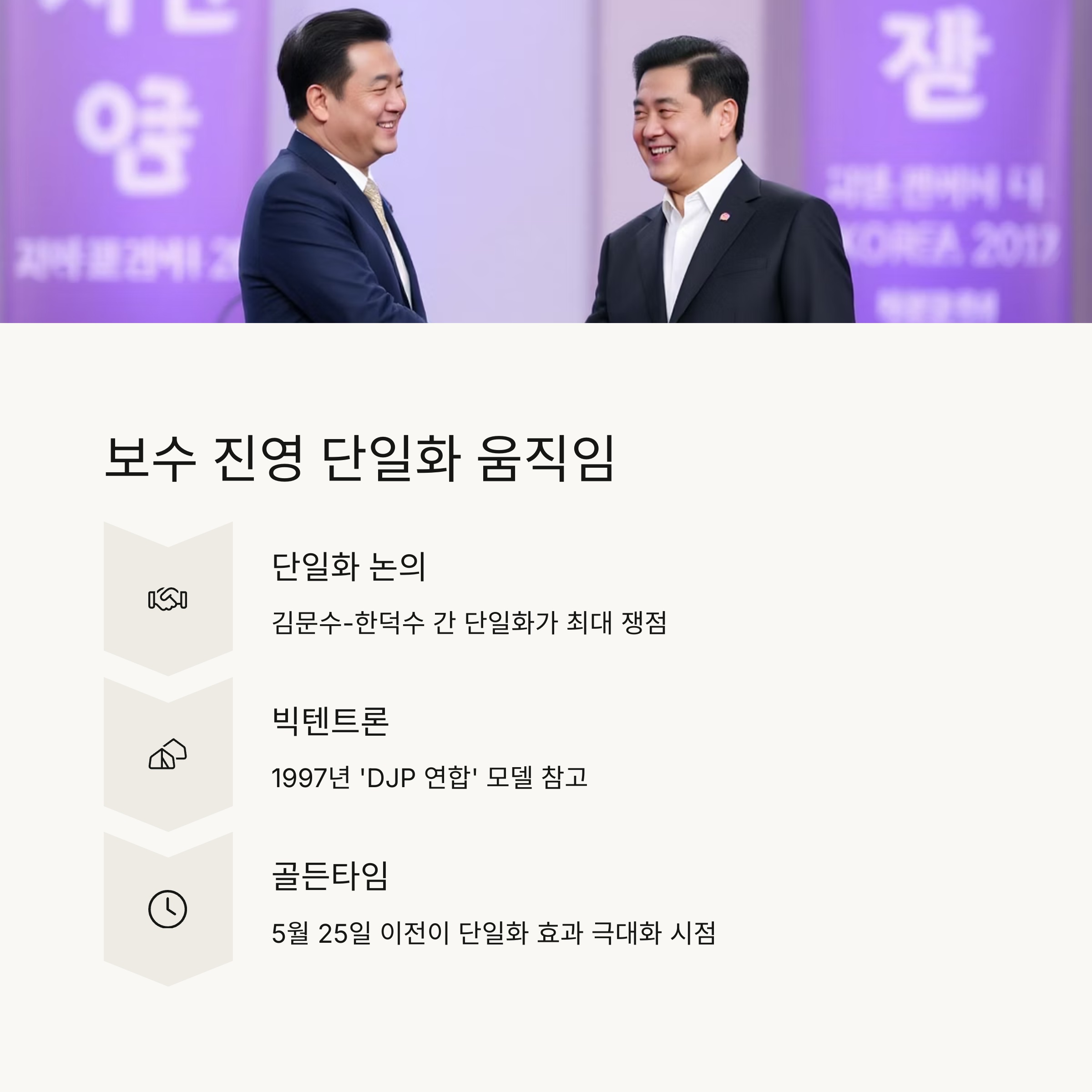 정치권에서는 단일화의 '골든타임'이 5월 25일 이전이라는 분석이 나오고 있습니다. 단일화가 늦어질수록 효과가 감소할 수 있다는 우려가 있으며, 이에 따라 양측은 속도감 있는 협상을 진행 중입니다.